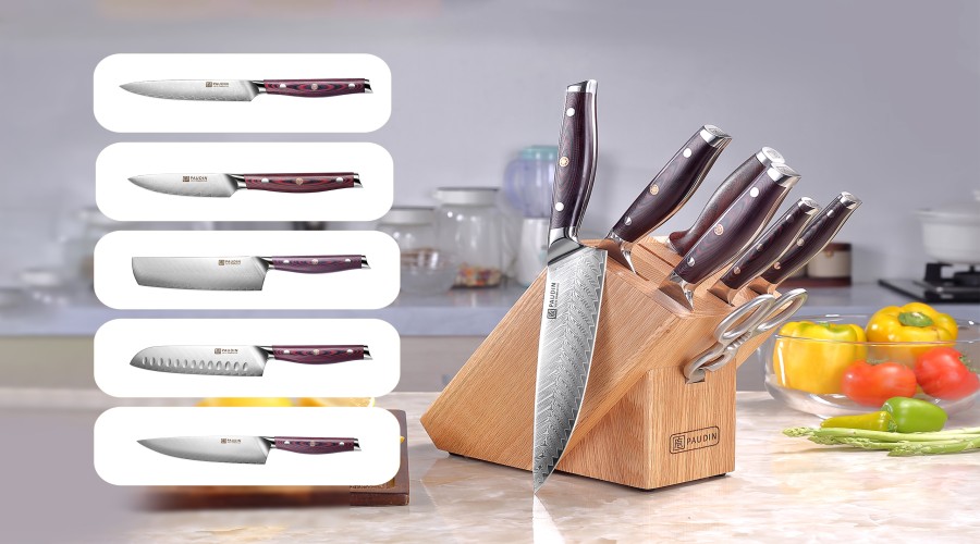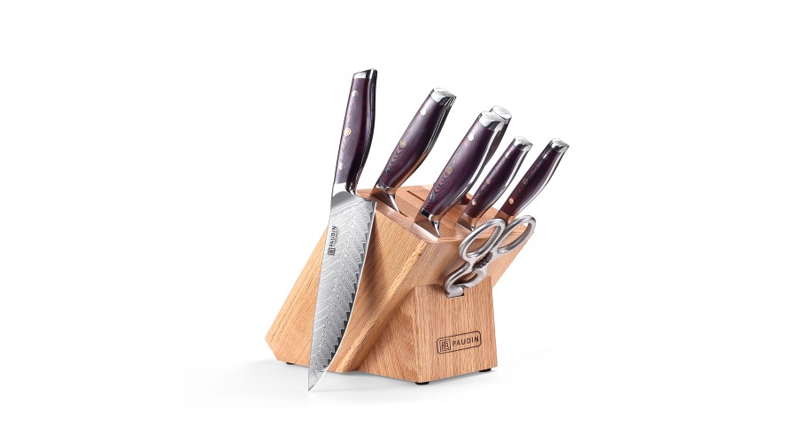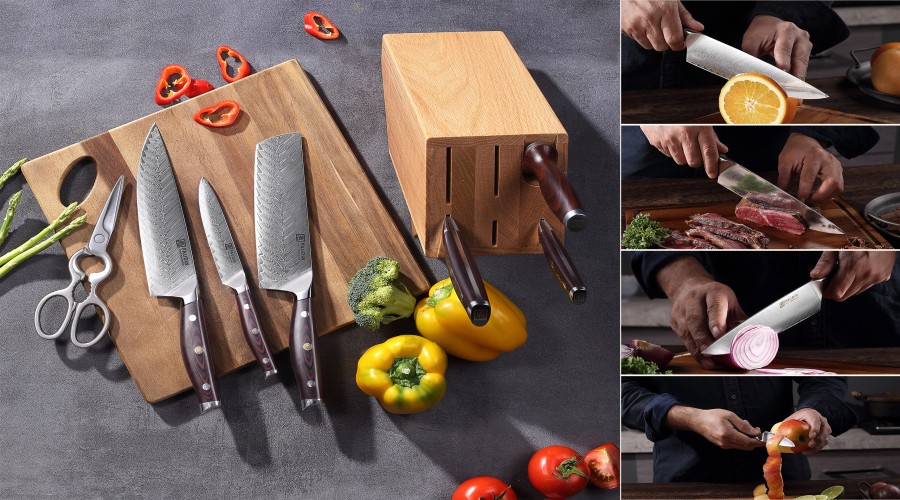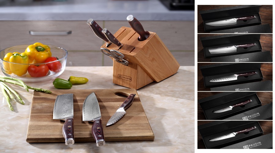 This set of Damascus kitchen knives carries on the cutting of traditional Damascus steel (the Damascus Knife is tough, durable, and handmade from a 100% Damascus steel, which is hailed as the first of the world’s three famous knives owning to its premium performance and characteristic pattern). The P series set contains 5 types of knives-1x chef knife, 1x carving knife, 1x bread knife, 1x utility knife,1x fruit knife, 1x kitchen shear and 1x honing rod , which can cut fruits and vegetables.